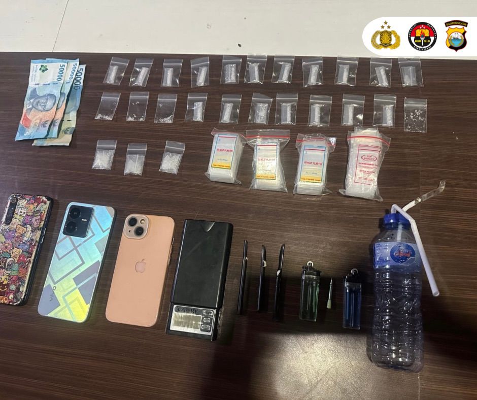 Dari hasil penggeledahan, petugas menemukan 25 sachet plastik berisi kristal bening yang diduga sabu, terdiri dari tiga sachet berukuran sedang dan 22 sachet kecil. Selain itu, turut diamankan dua unit ponsel Android, satu unit iPhone, satu timbangan digital, alat isap (bong) lengkap dengan kaca pirex, uang tunai Rp150.000 hasil penjualan sabu, serta beberapa pack plastik kosong dan pipet.